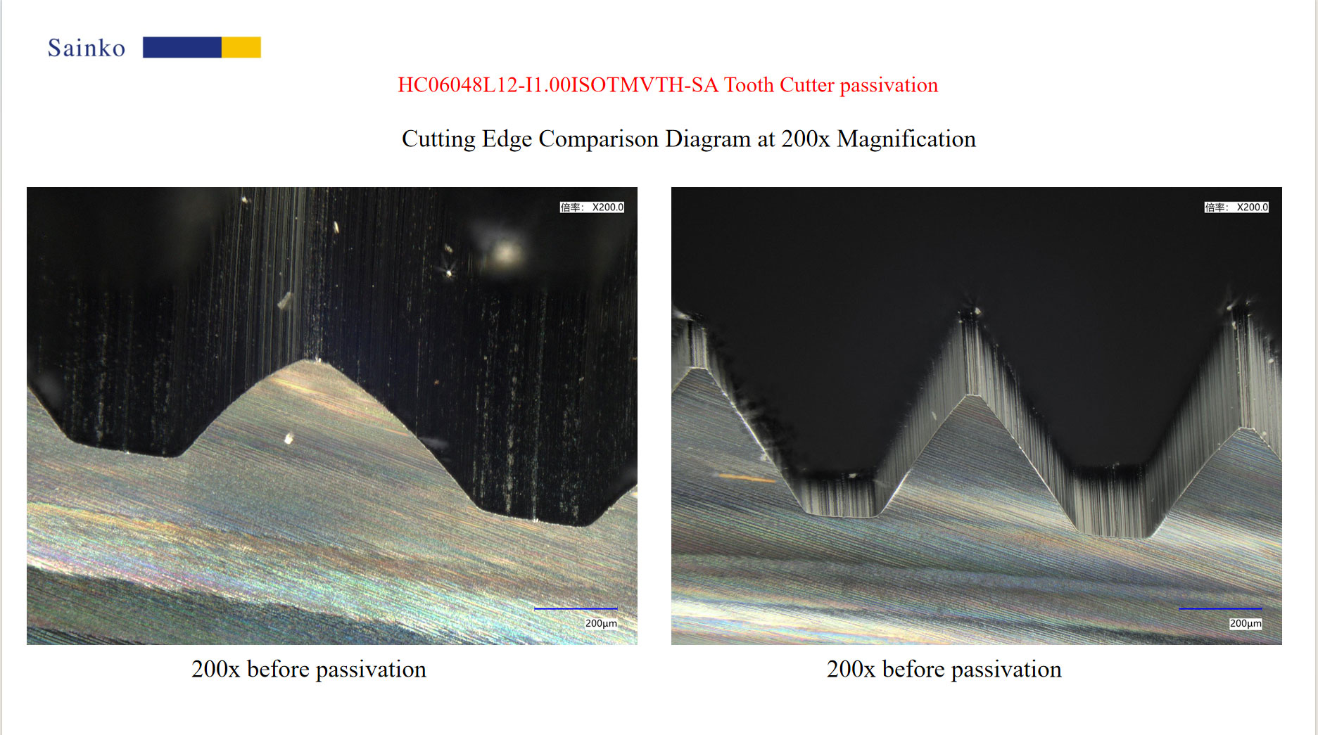By comparative observation, it can be seen that there are obvious small serrations and burrs on the cutting edge before passivation, and the cutting edge is irregular, which can easily cause problems such as high cutting resistance and poor surface roughness; After passivation, the blade is flat and smooth, with a uniform and rounded shape, and no residual burrs. This improvement effectively enhances the surface quality of processed products, optimizes the chip discharge effect, and significantly reduces the risk of chip accumulation and workpiece scratches.