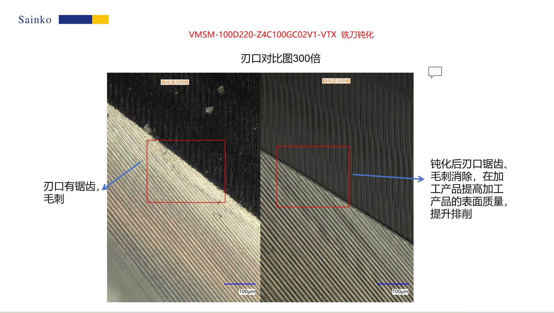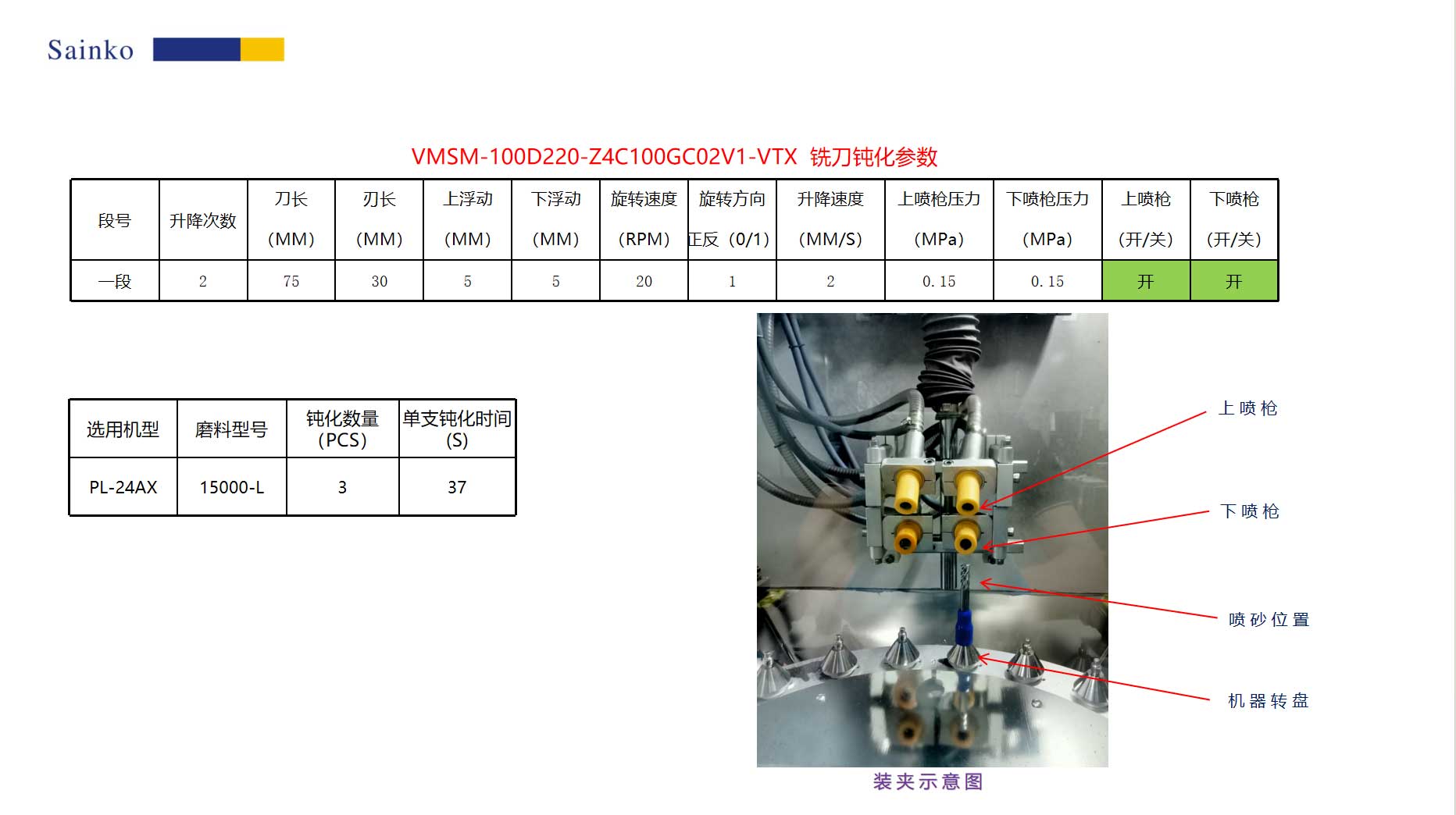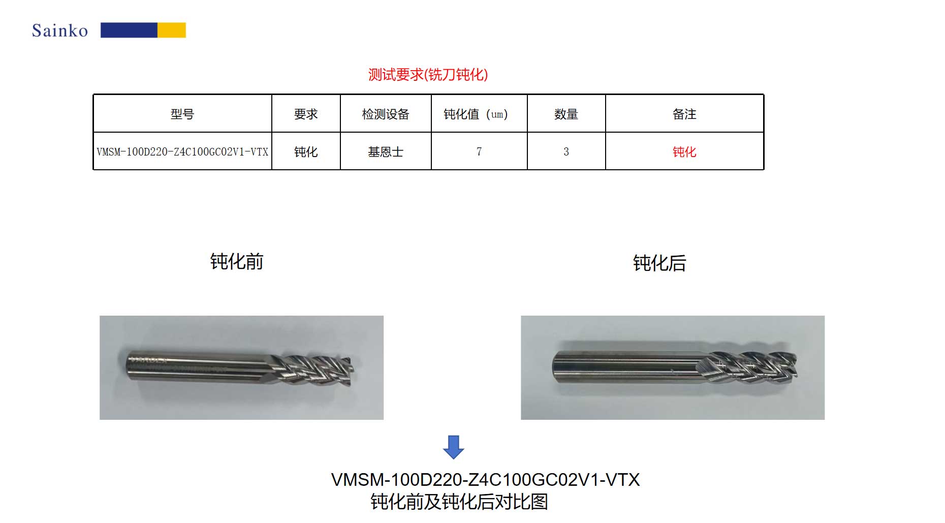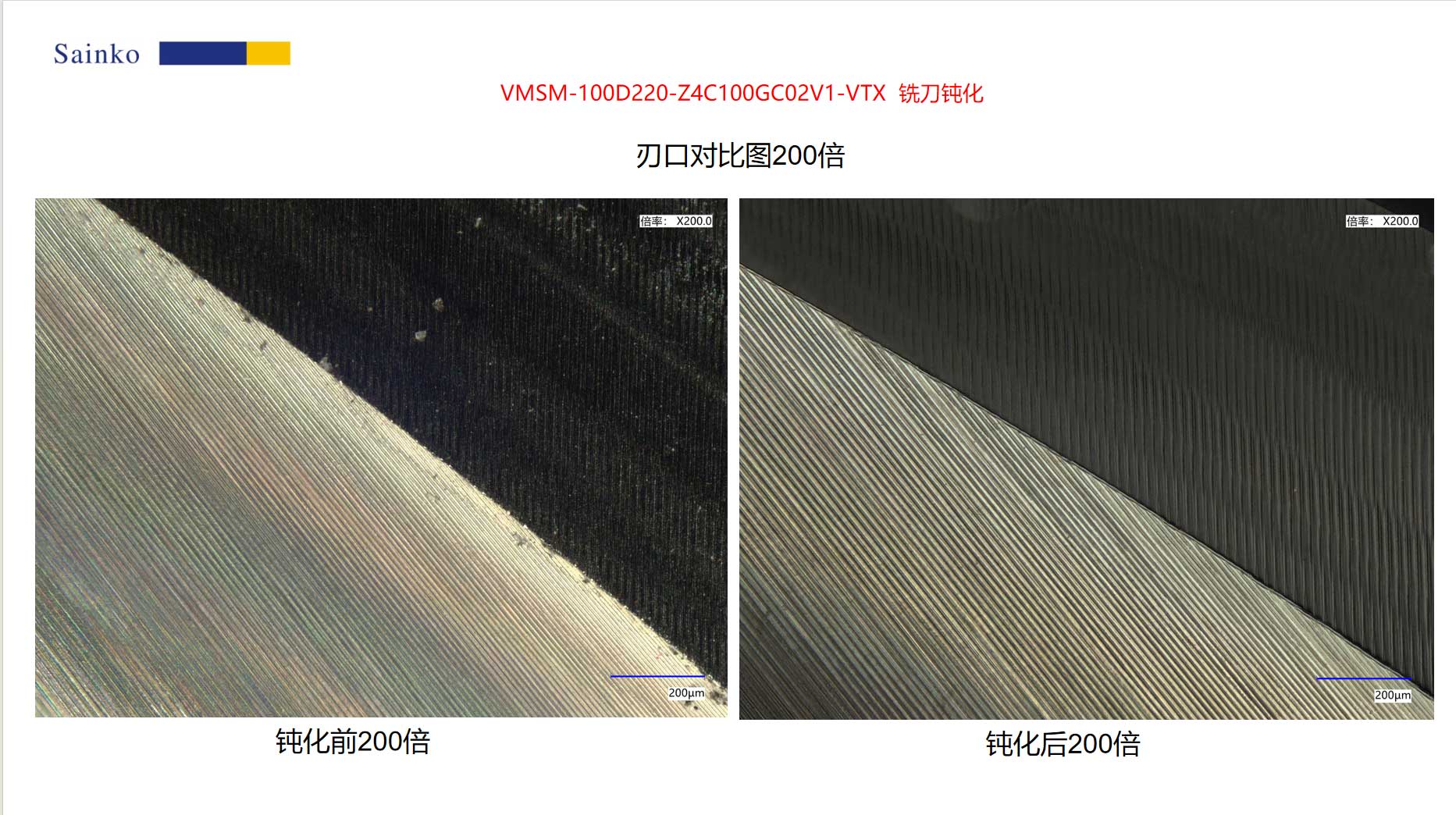 本次測(cè)試樣品為客戶提供的銑刀,型號(hào)為VMSM-100D220-Z4C100GC02V1-VTX,共計(jì) 3 件,核心需求為銑刀鈍化處理,且明確鈍化值需達(dá)到 7μm 標(biāo)準(zhǔn)。為精準(zhǔn)滿足需求,我司采用PL-24AX鈍化設(shè)備,并搭配15000-L型號(hào)磨料開(kāi)展加工:通過(guò)設(shè)備對(duì)鈍化轉(zhuǎn)速、壓力等參數(shù)的精準(zhǔn)調(diào)控,結(jié)合磨料的精細(xì)研磨作用,終 3 件銑刀的鈍化值均穩(wěn)定達(dá)到 7μm 預(yù)設(shè)要求,同時(shí)消除了刃口原始存在的鋸齒與毛刺。經(jīng)后續(xù)驗(yàn)證,鈍化后的銑刀在切削加工過(guò)程中,不僅能顯著提高加工產(chǎn)品的表面質(zhì)量,還優(yōu)化了切屑排出效果,有效減少切屑堆積、劃傷工件的問(wèn)題,具體測(cè)試結(jié)果詳見(jiàn)本報(bào)告。
